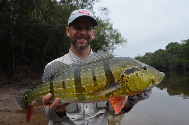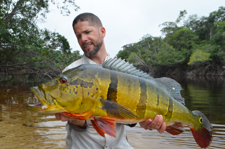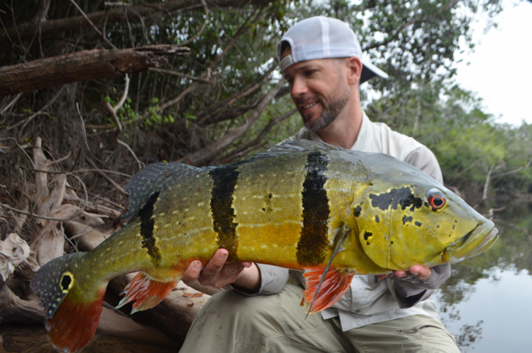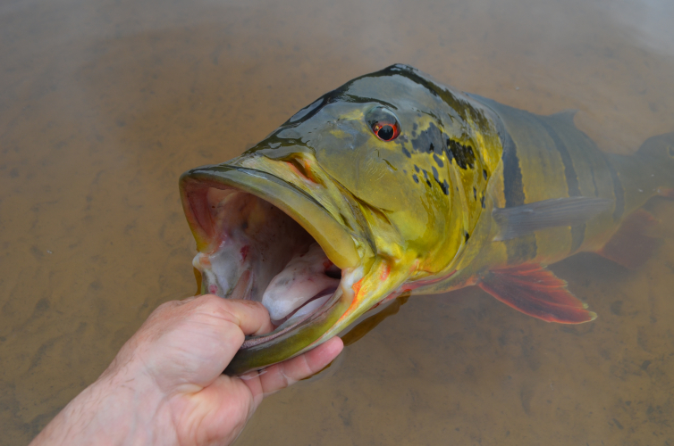 Various species of Peacock Bass, including the largest-growing Temensis and the most beautiful Mariposa, as well as large payaras, piranhas, bicudas, pacus, yamus, catfish species, and large stingrays inhabit the river.