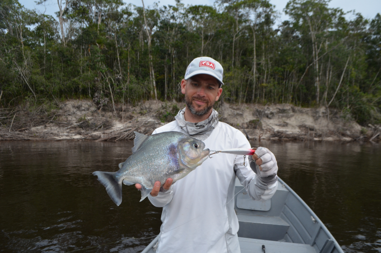 10-12 weight fly rods. Flies: mice, poppers, streamers between 14-25 cm, in color combinations of fluoro green-white, black-red, black-lemon, purple, blue, and green. For spinning, 30-40 gram spinning rods, PE 1.5 braided line, and 0.50 mono or fluoro leaders are recommended. Jerkbaits around 14 cm, poppers around 12 cm, walk-the-dog lures, spinnerbaits, large-size minnow lures (RH color is strongly recommended), single BKK Diablo hooks or barbless treble VMC Kaptain hooks are suggested. Bite-proof steel leaders are recommended for payara.